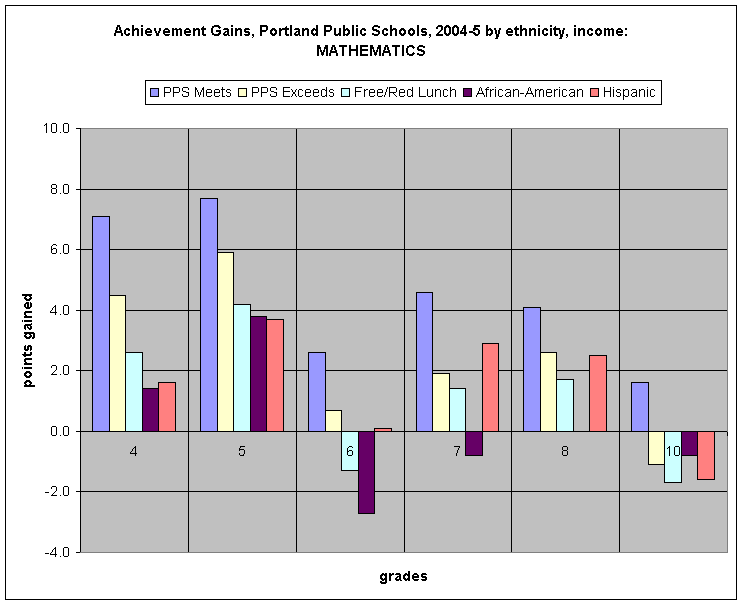 Achievement Gains, Portland Public Schools, 2004-5, by ethnicity, income