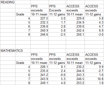 I was curious to see whether the testing ceiling was in fact making it impossible for high-achieving students to make gains, so I compared the gains made by ACCESS students with those of other students in Portland who "exceeded" benchmarks. ACCESS admits students in the top 1% of achievement--if there was a ceiling they should be hitting it harder than other students. They might have higher scores to begin with, but they would not have higher gains. If, on the other hand, the difference is a reflection of real differences in instruction, then ACCESS students might continue to outperform other students in PPS who also exceeded benchmarks.
