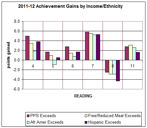 score from both 2010-11 and 2011-12. The data for "gains" subtracts student achievement test scores for each student in 2010 from the achievement test score for the same student in 2011 except in the case of eleventh-grade gains. As there is no ninth or tenth grade test, the scores of students from 2008, when they were in the eighth grade, are subtracted from their scores for 2011 when they were in the eleventh grade. Students taking the test are grouped by ability in five groups: "Very Low, Low, Nearly Meets, Meets, and Exceeds."The first column shows the average gain from one year to the next for all Portland students who exceeded the benchmarks. The following columns show score gains for Free and Reduced Lunch, African-American, and Hispanic American students who exceeded benchmarks in the previous year's test.
