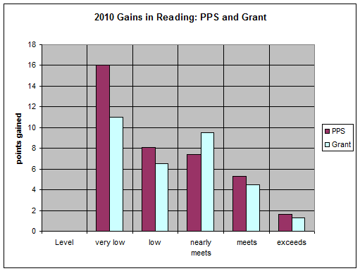 The District mean score in reading was 240.8; Grant's was 244 . The District mean score in math was 238; Grant's was 241.7 . The higher absolute student scores conceal the fact that student growth in reading from 8th. to 11th. grade was lower for most groups at Grant than on average in PPS. The students who entered Grant were probably above the district average, but once they were there, they gained less on average in reading than their classmates in other Portland High Schools. The "probably" is because we don't have 9th. grade scores. The one exception was the group of students who "nearly met". These students did better at Grant.
